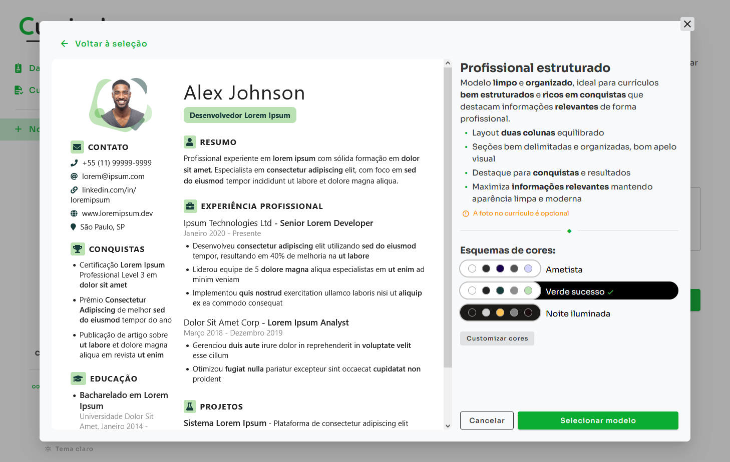 Escolha entre diversos templates elegantes e modernos, todos otimizados para sistemas de seleção automática.